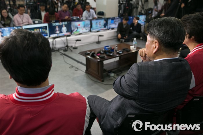 (서울=포커스뉴스) 제20대 국회의원 선거날인 13일 오후 서울 여의도 새누리당사에서 비례대표 후보들과 당직자들이 심각한 표정으로 개표방송을 시청하고 있다.