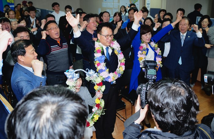 | △ 20대 총선 당선 기뻐하는 더민주 박광온 |