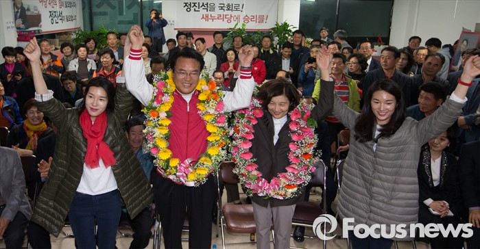 (공주=포커스뉴스) 제20대 충남 공주부여청양 국회의원에 당선된 정진석 새누리당 당선인이 13일 오후 충남 공주 선거사무소에서 부인 이미호 여사, 두 딸과 함께 환호하고 있다.