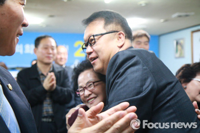(서울=포커스뉴스) 제20대 국회의원선거일인 13일 민병두 더불어민주당 동대문구을 후보가 당선이 확실시되자 서울 동대문구 자신의 사무소에서 세리머니를 하고 있다. <사진제공=민병두 후보 선거사무소>