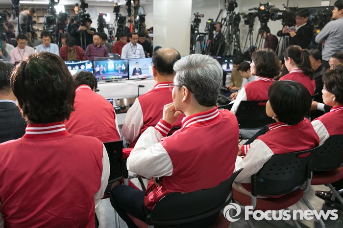 (서울=포커스뉴스) 제20대 국회의원 선거날인 13일 오후 서울 여의도 새누리당사에서 비례대표 후보들과 당직자들이 심각한 표정으로 개표방송을 시청하고 있다.