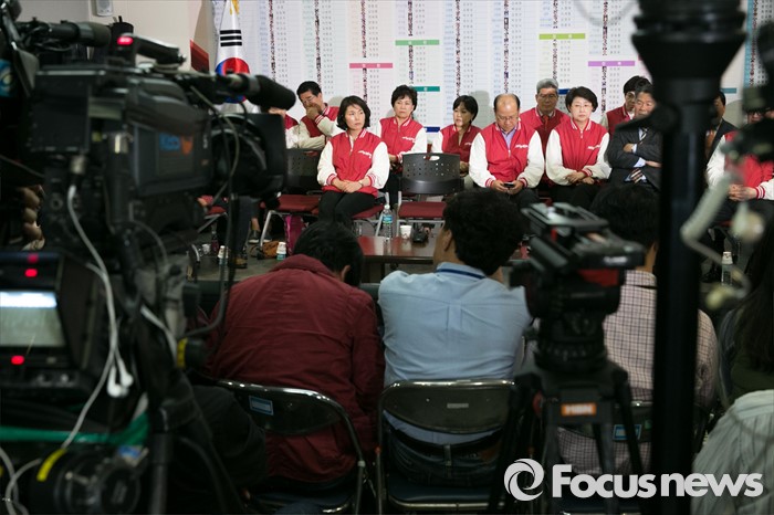 (서울=포커스뉴스) 제20대 국회의원 선거날인 13일 오후 서울 여의도 새누리당사에서 비례대표 후보들과 당직자들이 심각한 표정으로 개표방송을 시청하고 있다.