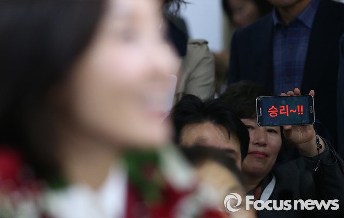 (서울=포커스뉴스) 제20대 국회의원 선거날인 13일 오후 서울 동작구에 위치한 나경원 새누리당 동작구을 후보 선거사무실에서한 지지자가 승리의 문구를 선보이고 있다.