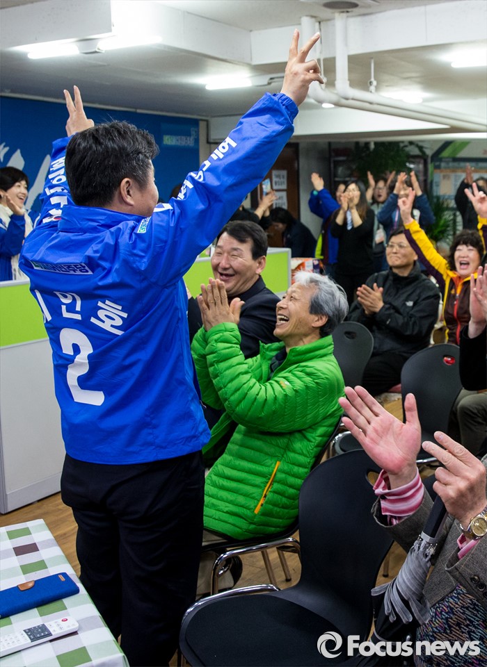 (부산=포커스뉴스) 최인호 더불어민주당 부산 사하구갑 후보가 13일 오후 부산 사하구 선거사무소에서 개표방송 결과 시청 도중 앞서고 있다는 소식에 지지자들과 기쁨을 나누고 있다.