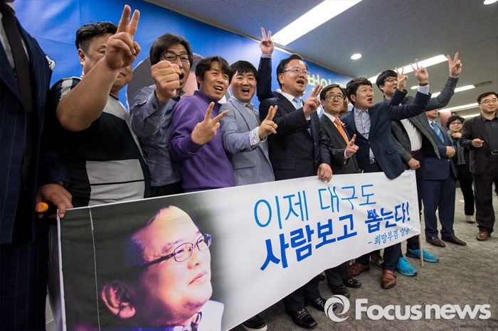 (대구=포커스뉴스) 제20대 국회의원선거 대구 수성구갑 선거구에서 당선이 확실시된 더불어민주당 김부겸 후보가 13일 오후 대구 수성구 선거사무소에서 지지자들과 '이제 대구도 사람보고 뽑는다'는 구호를 외치며 사진촬영을 하고 있다.