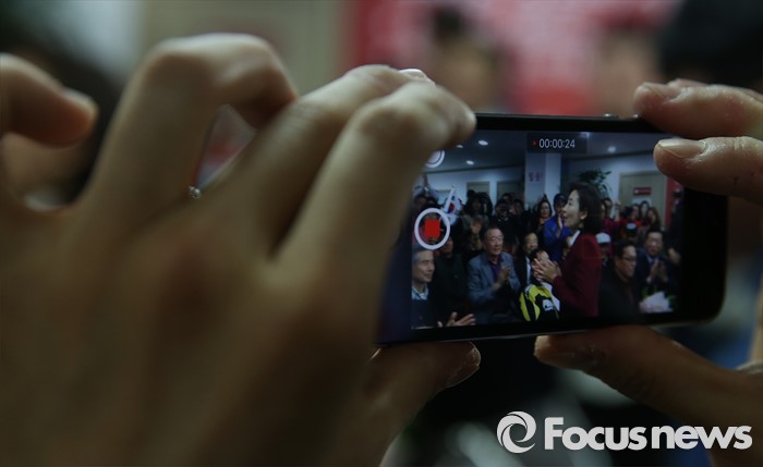(서울=포커스뉴스) 제20대 국회의원 선거날인 13일 오후 서울 동작구에 위치한 나경원 새누리당 동작구을 후보 선거사무실에서 한 지지자가 동영상을 촬영하고 있다.