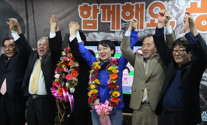 2위는 득표율 31.7%의 새누리당 주대준 후보가 차지했다.(서울=포커스뉴스) 20대 총선에서 당선이 확정된 이언주 더불어민주당 경기 광명을 후보가 13일 경기도 광명 자신의 선거캠프에서 지지자들과 손을 들어 기뻐하고 있다. <사진제공=이언주 후보 선거사무소> 2016.04.13 포커스포토