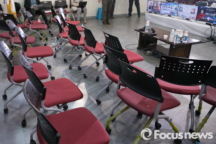 (서울=포커스뉴스) 제20대 국회의원 선거날인 13일 오후 서울 여의도 새누리당사 내 선거상황실 자리가 텅 빈채, 개표방송이 중계되고 있다.