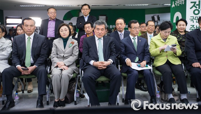 (서울=포커스뉴스) 이상돈 국민의당 공동선대위원장(가운데)과 임내현 선대위 상황본부장(오른쪽 두번째)이 13일 오후 서울 마포구 국민의당 당사 개표 상황실에 앉아 제 20대 총선 개표 방송을 지켜보고 있다.
