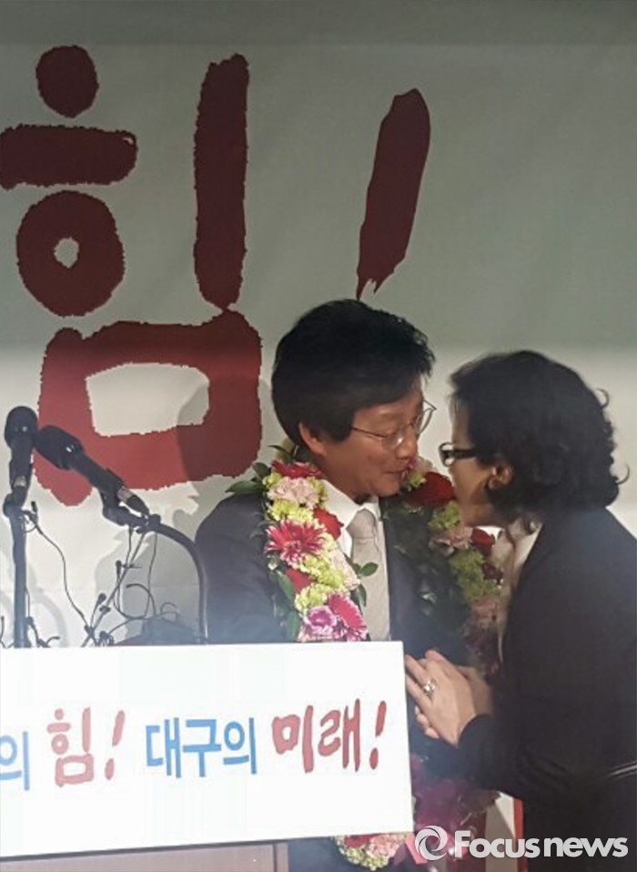 | △ 지지자에게 축하 받는 유승민 후보 |