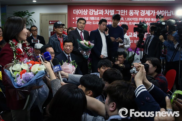 (서울=포커스뉴스) 제20대 국회의원 선거날인 13일 오후 서울 동작구에 위치한 선거사무실에서 나경원 새누리당 동작구을 후보가 인터뷰를 하고 있다.