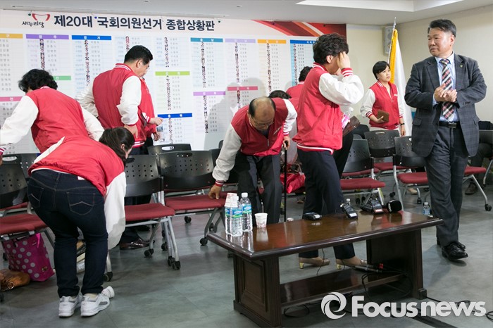 (서울=포커스뉴스) 제20대 국회의원 선거날인 13일 오후 서울 여의도 새누리당사에서 비례대표 후보들과 당직자들이 개표방송 시청을 마친 뒤, 자리를 떠나고 있다.