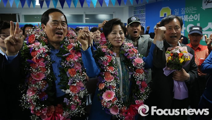 (서울=포커스뉴스) 14일 오전 서울 송파구에 위치한 선거사무실에서 남인순(사진 가운데) 더불어민주당 송파구병 후보가 지지자들에게 축하를 받고 있다.