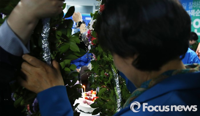 (서울=포커스뉴스) 14일 오전 서울 송파구에 위치한 선거사무실에서 남인순 더불어민주당 송파구병 후보가 지지자들에게 축하를 받고 있다.