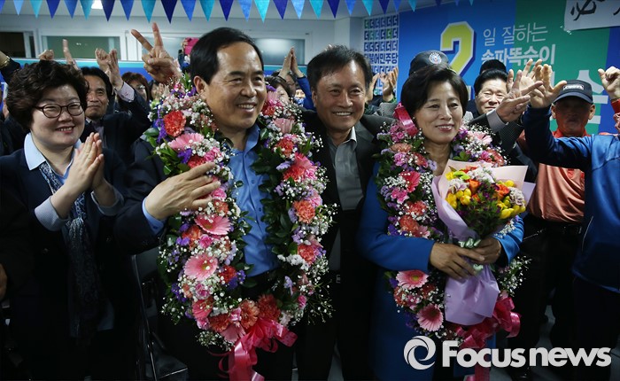 (서울=포커스뉴스) 14일 오전 서울 송파구에 위치한 선거사무실에서 남인순 더불어민주당 송파구병 후보가 지지자들에게 축하를 받고 있다.