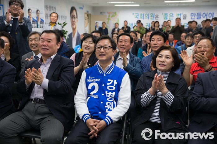 (서울=포커스뉴스) 강병원 더불어민주당 은평을 후보가 14일 오전 서울 은평구 선거사무소에서 개표방송을 보며 지지자들과 함께 박수를 치고 있다.