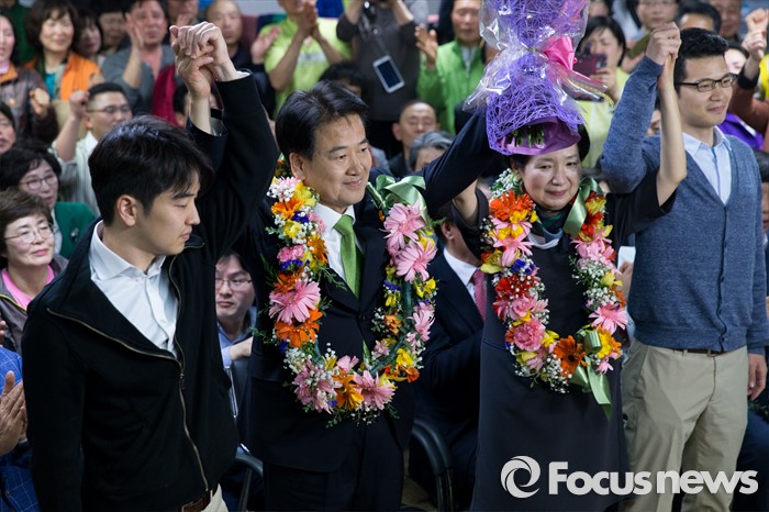 (전주=포커스뉴스) 정동영 국민의당 전주시병 당선인이 14일 오전 전북 전주시 금암동 선거사무소에서 당선이 확정되자 지지자들과 환호하고 있다.