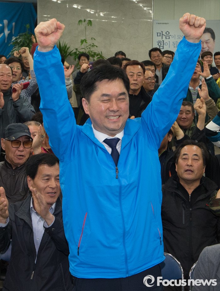 (논산=포커스뉴스) 제20대 충남 논산계룡금산 국회의원에 당선된 김종민 더불어민주당 당선인이 14일 논산 선거사무실에서 환호하고 있다.
