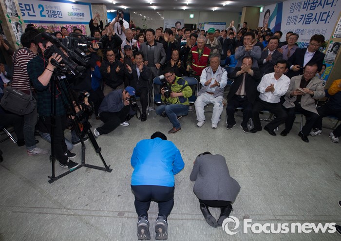 (논산=포커스뉴스) 제20대 충남 논산계룡금산 국회의원에 당선된 김종민 더불어민주당 당선인이 14일 논산 선거사무실에서 부인 홍윤정 여사와 함께 지지자들에게 큰절을 하고 있다.
