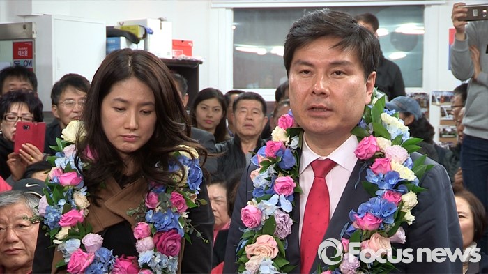 (서울=포커스뉴스) 20대 총선에서 당선이 확정된 지상욱 새누리당 중구성동을 후보가 14일 중구 신당동 선거사무소에서 당선 소감을 전하고 있다. 왼쪽은 부인 심은하 씨. <사진=포커스뉴스 영상캡쳐>