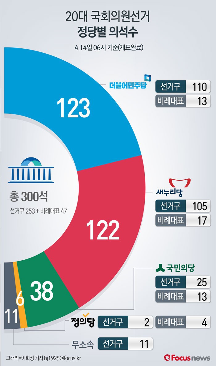 (서울=포커스뉴스) 20대 국회의원선거 개표결과 비례대표 의석수를 포함한 각 정당별 의석수는 더불어민주당이 123석, 새누리당 122석, 국민의당 38석, 정의당 6석, 무소속은 11석을 차지했다.