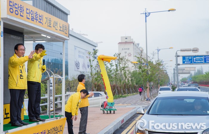 (창원=포커스뉴스) 제20대 국회의원선거 경남 창원 성산구 국회의원에 당선된 노회찬 정의당 당선인이 14일 오전 창원시 위아사거리에서 출근길 시민들에게 당선인사를 하고 있다.