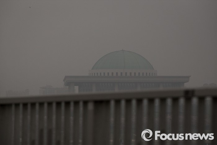 (서울=포커스뉴스) 제 20대 국회의원 선거가 끝난 14일 오전 서울 마포구 마포대교에서 안개에 둘러싸인 국회가 보이고 있다.