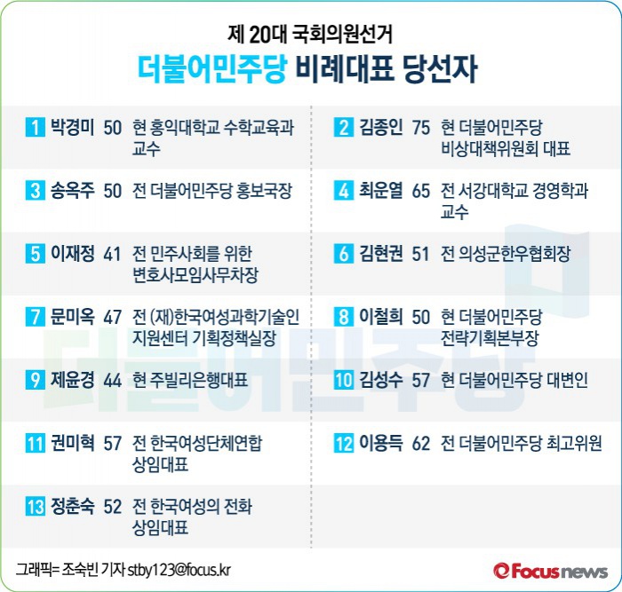 이외에도 9번 제윤경(44·여) 주빌리 은행 대표, 10번 김성수(59) 더민주 수석대변인, 11번 권미혁(57·여) 더민주 뉴파티위원장 등이 비례대표 당선자 명단에 이름을 올렸다. 또 노동계 몫의 12번 이용득(62) 전 한국노총 위원장과 정춘숙(52·여) 전 한국여성의전화 상임대표도 13번으로 20대 국회에 등원을 앞두고 있다.제 20대 국회의원선거 결과, 더불어민주당은 총 13명의 비례대표가 국회에 입성할 수 있게 됐다. 2016.04.14 조숙빈 기자