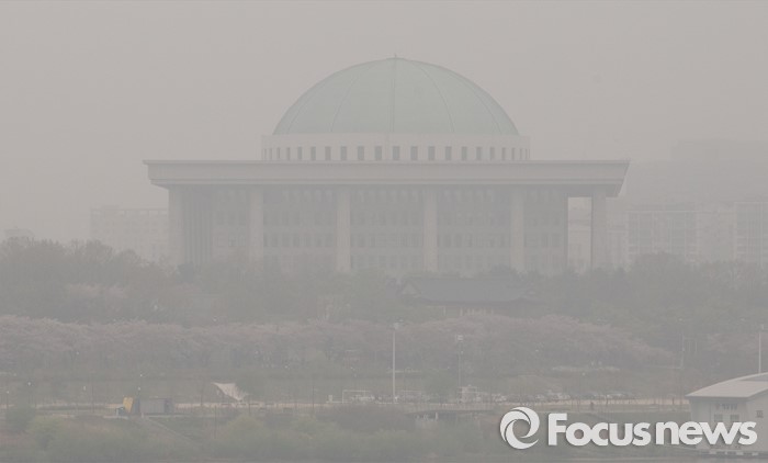 (서울=포커스뉴스) 제 20대 국회의원 선거가 끝난 14일 오전 서울 마포구 마포대교에서 안개에 둘러싸인 국회가 보이고 있다.