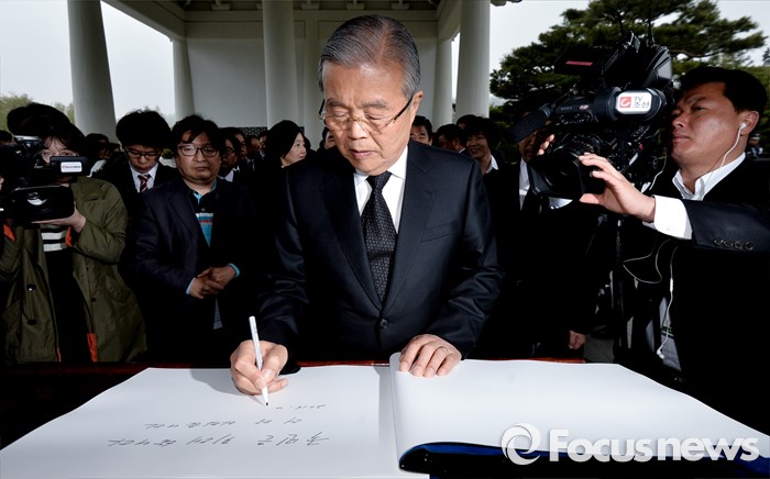 (서울=포커스뉴스) 김종인 더불어민주당 비대위 대표가 14일 오전 동작구 국립서울현충원에서 현충탑 참배를 마친 뒤 방명록을 작성하고 있다.