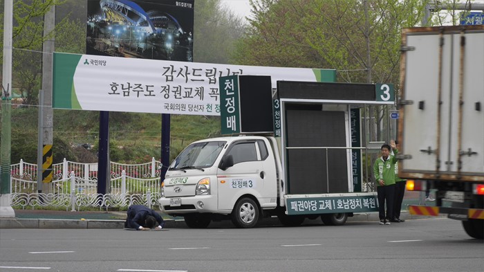 (광주=포커스뉴스) 14일 오전 광주 서구 풍암동 장미공원 사거리에서 제20대 국회의원 선거 광주 서구을에 당선된 천정배 국민의당 공동대표가 유권자들에게 감사를 표하며 큰절을 하고 있다. <사진제공=천정배 선거사무소>