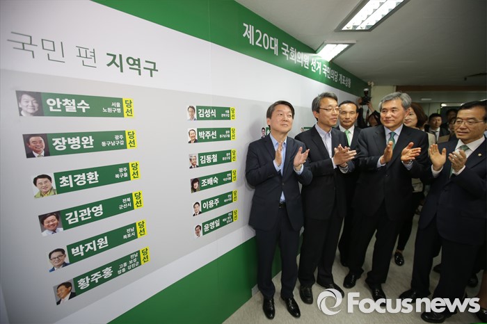 (서울=포커스뉴스) 안철수 국민의당 상임공동대표가 14일 오전 마포구 당사에서 선거 상황판에 당선된 후보들의 이름표를 붙이고 박수를 치고 있다. 왼쪽부터 안 대표, 김성식 관악구갑 국회의원 당선자, 이상돈 비례대표.