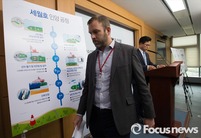 (세종=포커스뉴스) 14일 오전 세종시 정부세종청사 해양수산부 기자실에서 Simon Burthem TMC 지사장이 세월호 인양 작업 관련 질문에 답변을 마치고 단상을 내려가고 있다.