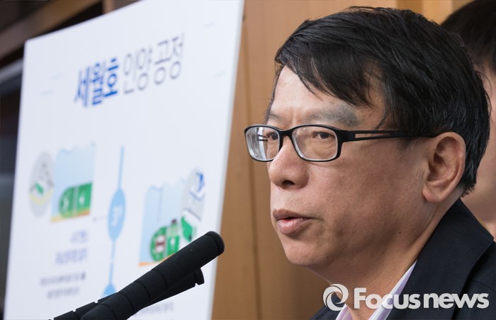 (세종=포커스뉴스) 왕웨이핑 세월호 인양 현장 총감독이 14일 오전 세종시 정부세종청사 해양수산부 기자실에서 세월호 인양 작업에 대해 설명하고 있다.