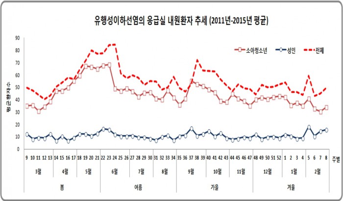 유행성 이하선염의 응급실 내원환자 추세(2011년~2015년 평균)를 살펴보면 3월 초중고교가 개학함에 따라 학교에서 감염된 환자가 2~3주의 잠복기를 거쳐 4월부터 환자가 늘어나는 것으로 분석됐다.