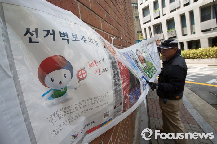 (서울=포커스뉴스) 제20대 국회의원 선거가 끝난 14일 오후 서울 서초구 일대에서 서초3동 주민센터 직원이 벽보를 철거하고 있다.