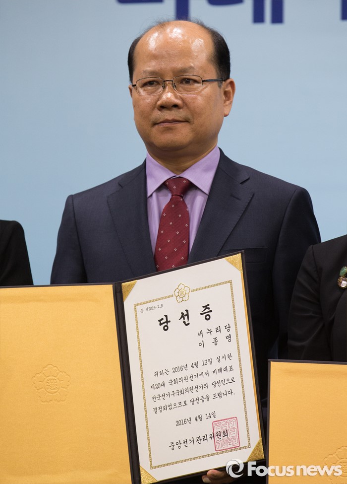 (과천=포커스뉴스) 14일 오후 경기도 과천 중앙선거관리위원회 회의실에서 열린 제20대 국회의원선거 비례대표국회의원 당선증 교부식에 참석한 이종명 새누리당 당선인이 기념촬영 하고 있다.