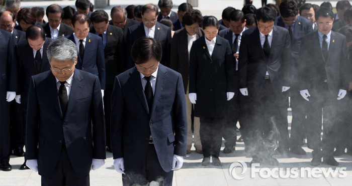 (광주=포커스뉴스) 14일 오후 광주 북구 국립5.18민주묘지에서 천정배 국민의당 공동대표를 비롯한 광주 지역 당선자들이 참배를 하고 있다.