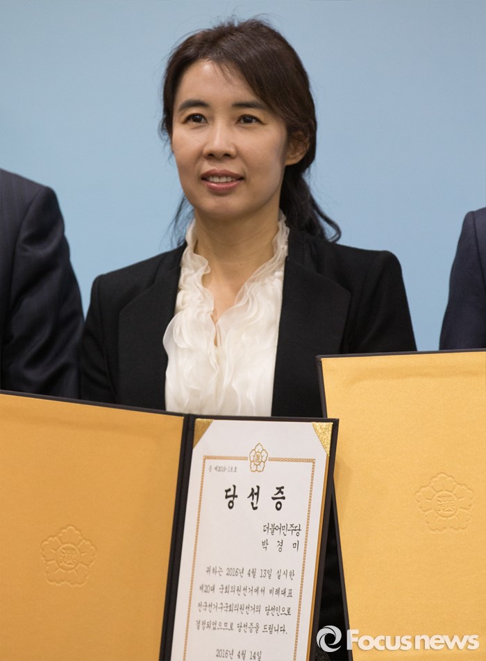 (과천=포커스뉴스) 14일 오후 경기도 과천 중앙선거관리위원회 회의실에서 열린 제20대 국회의원선거 비례대표국회의원 당선증 교부식에 참석한 박경미 더불어민주당 당선인이 기념촬영 하고 있다.