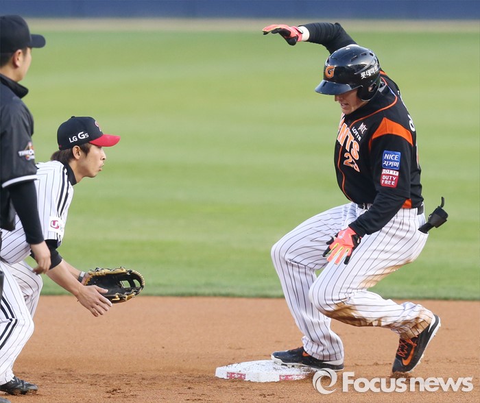 (서울=포커스뉴스) 14일 서울 잠실구장에서 열린 2016 프로야구 롯데-LG 경기 1회초 1사 2루에서 롯데 아두치가 우익수 오른쪽에 떨어지는 1타점 2루타를 치고 2루에 슬라이딩하며 들어가고 있다. 왼쪽은 LG 유격수 황목치승.