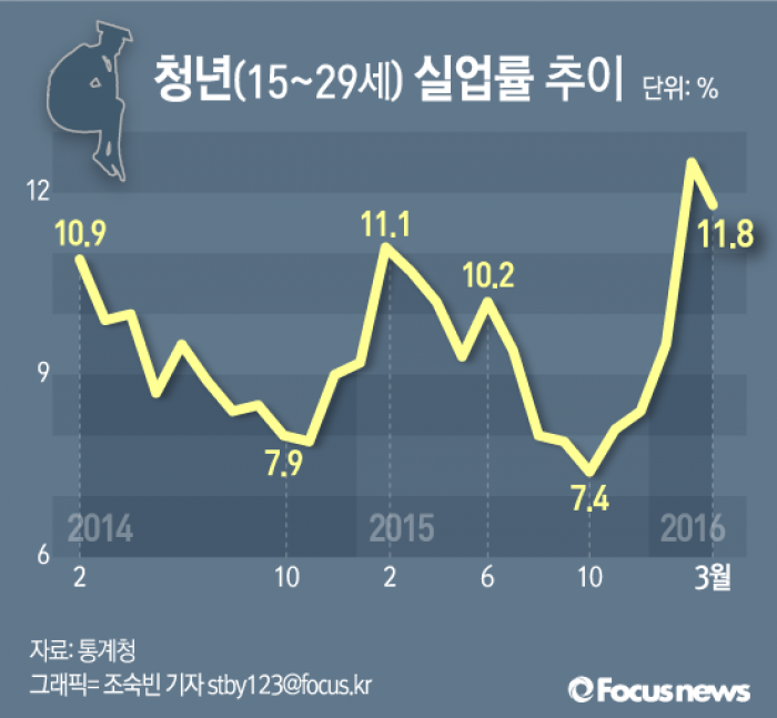 (서울=포커스뉴스) 통계청이 15일 발표한 '고용동향'에 따르면 3월 청년(15∼29세) 실업률은 11.8%로 전년 동월 대비 1.1%포인트(6만4000명) 증가했다.
