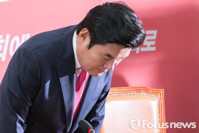 (서울=포커스뉴스) 새누리당 긴급 최고위원회에서 비상대책위원장으로 추대된 원유철 원내대표가 15일 오전 서울 여의도 국회 원내대표실에서 기자회견 전, 인사하고 있다.