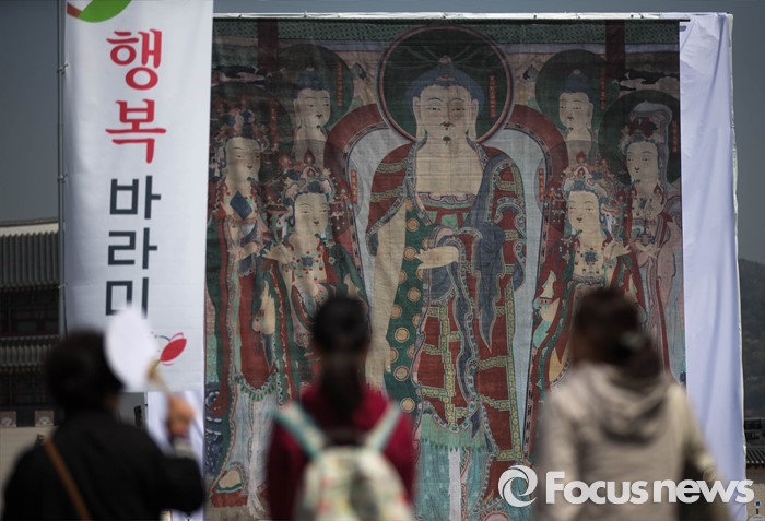 (서울=포커스뉴스) 15일 오전 서울 중구 광화문광장에서 열린 행복바라미 문화대축전 행사장에 대형 내소사영산회괘불탱이 걸려 있다. 괘불이란 절에서 큰 법회나 의식을 행하기 위해 법당 앞 뜰에 걸어놓고 예배를 드리는 대형 불교 그림이다.