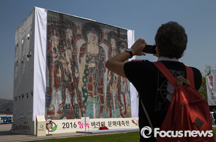 (서울=포커스뉴스) 한 관광객이 15일 오전 서울 중구 광화문광장에 설치된 대형 내소사영산회괘불탱 앞에서 사진을 찍고 있다. 괘불이란 절에서 큰 법회나 의식을 행하기 위해 법당 앞 뜰에 걸어놓고 예배를 드리는 대형 불교 그림이다.