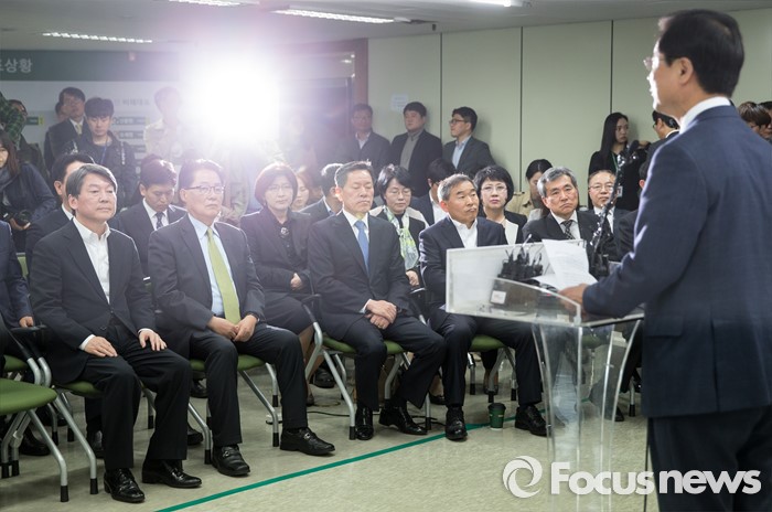 (서울=포커스뉴스) 15일 오전 서울 마포구 당사에서 열린 국민의당 당선자 대회 및 선거대책위원회 해단식에 안철수 상임공동 대표(왼쪽)와 박지원 의원이 참석하고 있는 가운데 천정배 상임공동대표가 인사말을 하고 있다.