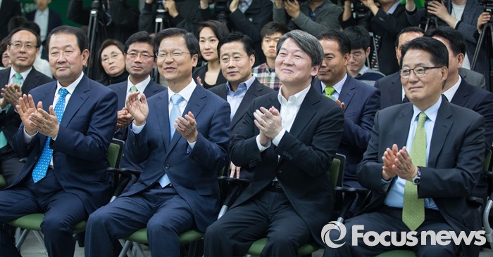 (서울=포커스뉴스) 안철수·천정배 상임공동대표 등 당지도부와 당선자들이 15일 오전 서울 마포구 당사에서 열린 국민의당 당선자 대회 및 선거대책위원회 해단식에서 박수를 치고 있다. 오른쪽부터 박지원 의원, 안 대표, 천 대표