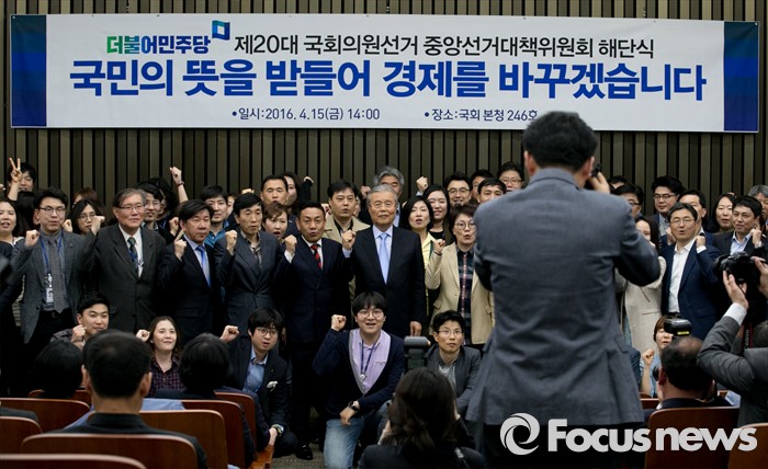 (서울=포커스뉴스) 김종인 더불어민주당 비대위 대표 겸 선대위원장과 당직자들이 15일 오후 서울 여의도 국회에서 열린 20대 총선 중앙선대위 해단식에 참석해 기념촬영을 하고 있다.