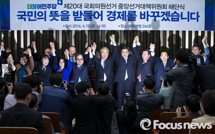 더민주는 새롭게 꾸려지는 비상대책위원회의 관리 속에 전당대회를 치르고 대선 준비에 돌입할 방침이다.김종인 더불어민주당 비대위 대표 겸 선대위원장과 선대위원들이 15일 오후 서울 여의도 국회에서 열린 20대 총선 중앙선대위 해단식에 참석해 손을 들어 포즈를 취하고 있다. 2016.04.15 박동욱 기자