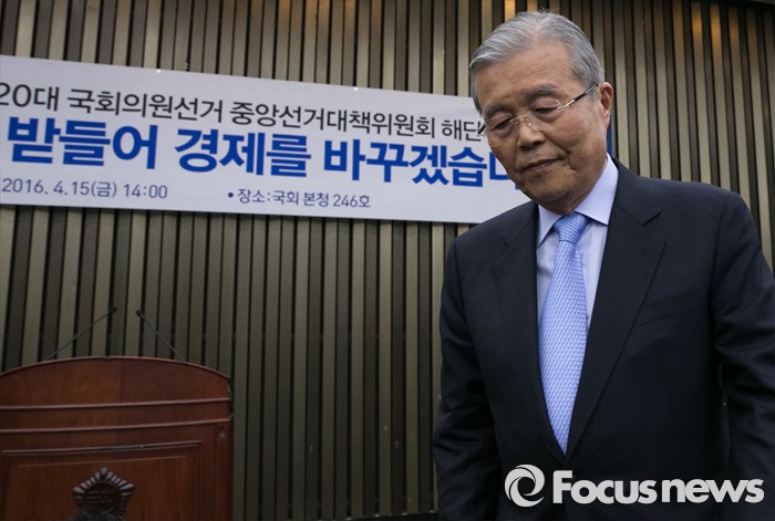 (서울=포커스뉴스) 김종인 더불어민주당 비대위 대표 겸 선대위원장이 15일 오후 서울 여의도 국회에서 열린 20대 총선 중앙선대위 해단식에 참석해 인사말을 마친 뒤 자리에 앉고 있다.