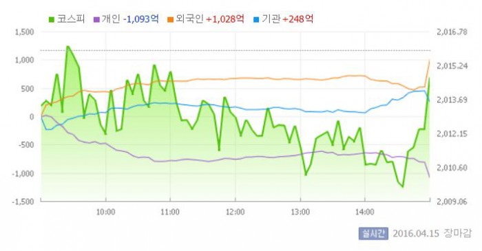 이날 코스피는 전일 대비 0.13% 하락한 2013.38로 장을 시작했다. 이후 지수는 외국인의 대규모 매수세로 낙폭을 방어했다.